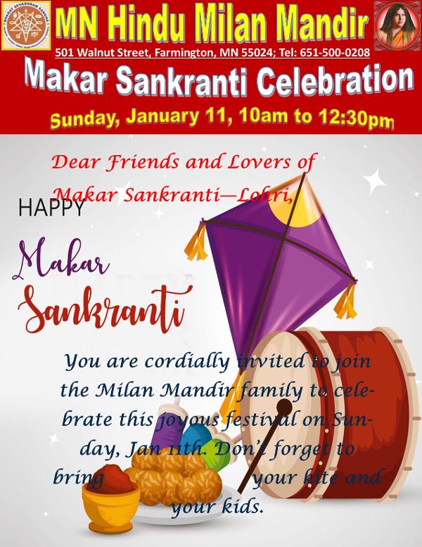 Your are cordially invited to celebrate Makar Sankranti with the Milan Mandir Family on Sunday, January 11th, 10am to 12:30pm. Lunch will be provided.